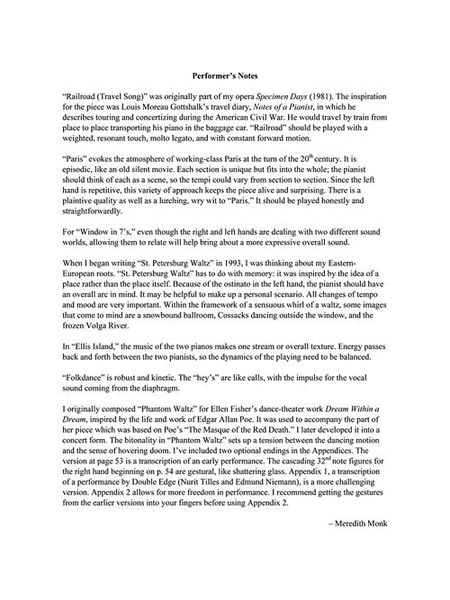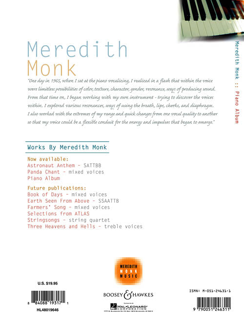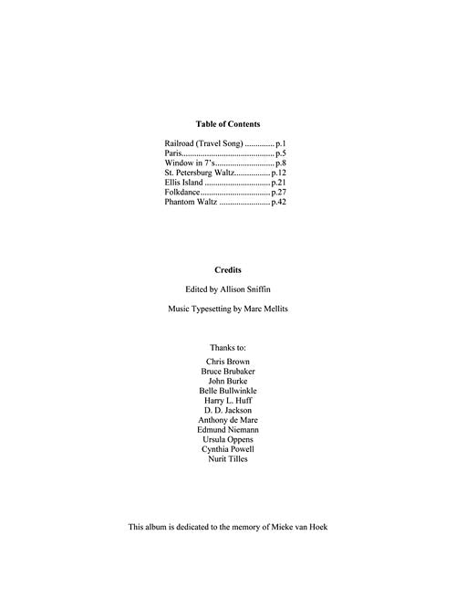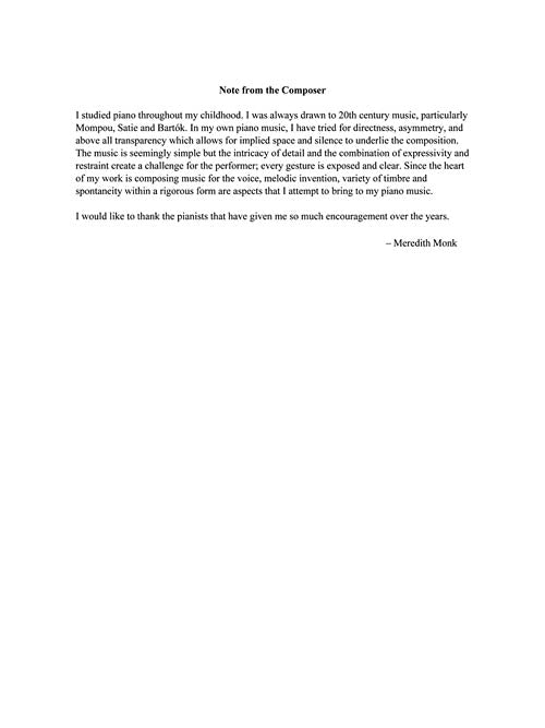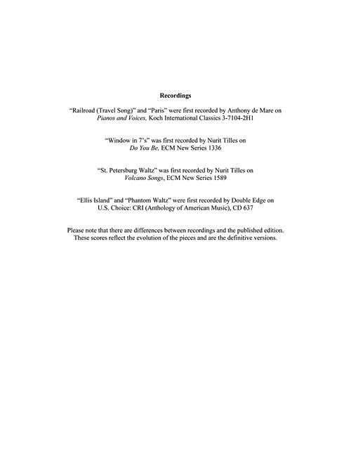 This collection for solo piano and 2 pianos features seven of Meredith Monk's original piano works. Contents: Railroad (Travel Song) · Paris · Window in 7's · St. Petersburg Waltz · Ellis Island · Folkdance · Phantom Waltz. Includes performance notes by the composer.