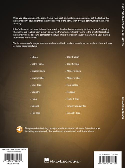 When you play a song on the piano from a fake book or sheet music, do you ever get the feeling that the chords don't sound right for the musical style of the song, even if you're constructing the chords correctly? If that's the case, you need to learn how to voice the chords appropriately for the style you're playing, whether you're reading from a chart or playing from memory. Chord voicing is the art of interpreting the chord symbols to sound correct for the style. This is the secret sauce that will help your playing sound more professional! Pianist, composer/arranger, educator, and author Mark Harrison introduces you to piano chord voicings for these essential styles: blues, classic rock, cool jazz, country, funk, Gospel, hip-hop, modern rock, pop ballad, smooth jazz, and many more! The piano chord voicing concepts are demonstrated with over 90 audio tracks, including play-along rhythm section accompaniment in all the styles! Audio is accessed online using the unique code inside the book and can be streamed or downloaded. The audio files include PLAYBACK+, a multi-functional audio player that allows you to slow down audio without changing pitch, set loop points, change keys, and pan left or right.