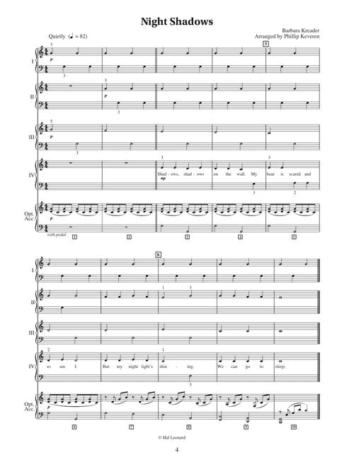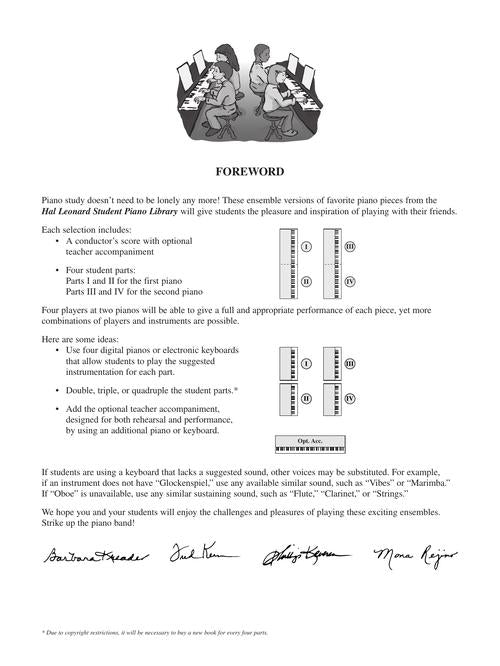 Four-part student ensembles arranged for two or more pianos. These ensembles, arranged by Phillip Keveren, feature student favorites from Book 1 of the Hal Leonard Student Piano Library. Each book contains four selections which include: · Four student parts · Conductor's score with optional teacher accompaniment · Performance configurations for 2 or more pianos · Suggested instrumentation for electronic keyboards. Four ensembles: Night Shadows · Party Cat · Trumpet Man · Go For The Gold.