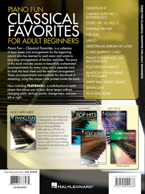 Piano Fun - Classical Favorites for Adult Beginners is a collection of lead sheets and arrangements for the beginning pianist who has learned to read music and wants to play easy arrangements of familiar melodies. The price of this book includes access to beautifully orchestrated accompaniments for every song and a separate track for the lead sheet and realized arrangement. These accompaniments are available for download or streaming using the unique code printed inside the book. Includes: Canon in D · Carmen Suite No. 1 (Intermezzo) · Etude, Op. 10, No. 3 · Evening Prayer · Für Elise · Largo · Liebestraum (Dream of Love) · O Mio Babbino Caro · Piano Sonata No. 14 (Moonlight) · Polovetzian Dance · Rhapsody on a Theme of Paganini · Sheep May Safely Graze · Swan Lake · To a Wild Rose.