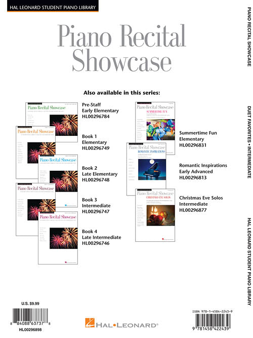 Piano Recital Showcase - Duet Favorites National Federation of Music Clubs 2014-2016 Selection 1 Piano, 4 Hands/Intermediate Level Publisher: Hal Leonard Category: Educational Keyboard Series: Educational Piano Library Format: Softcover Five original duets from top composers Phillip Keveren, Eugénie Rocherolle, Sondra Clark and Wendy Stevens. Each duet is a musical gem worthy of a recital feature. Students will love the variety of styles and keyboard techniques. Angel Falls · Crescent City Connection · Prime Time · A Wind of Promise · Yearning. To see other NFMC selections, click here (http://www.halleonard.com/promo/promo.do?promotion=183) . Inventory # : 00296898 UPC: 884088637378 ISBN: 1458422437 Width: 9" Length: 12" Height: 0.19" Product Weight: 0.6 lbs. Number of Pages: 72