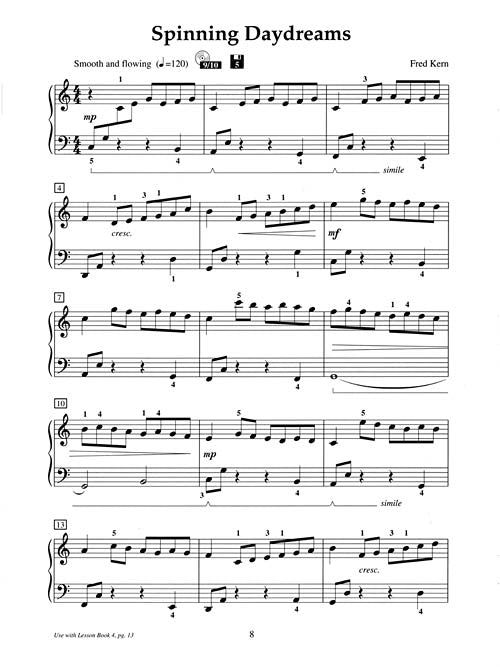 Piano Solos books feature original performance repertoire from 14 different composers. These inviting compositions provide ample reinforcement of skills and concepts learned in the corresponding-level Piano Lessons books. The outstanding variety of musical styles makes every solo an important piece in its own right - exciting to both performer and listener. Fully orchestrated accompaniments for every piece are avilable on CD or General MIDI disk. The CDs include both apractice and a performance tempo for each piece. Click on the audio icon to hear a sample of Latin Logic by Bill Boyd from Piano Solos Book 4.