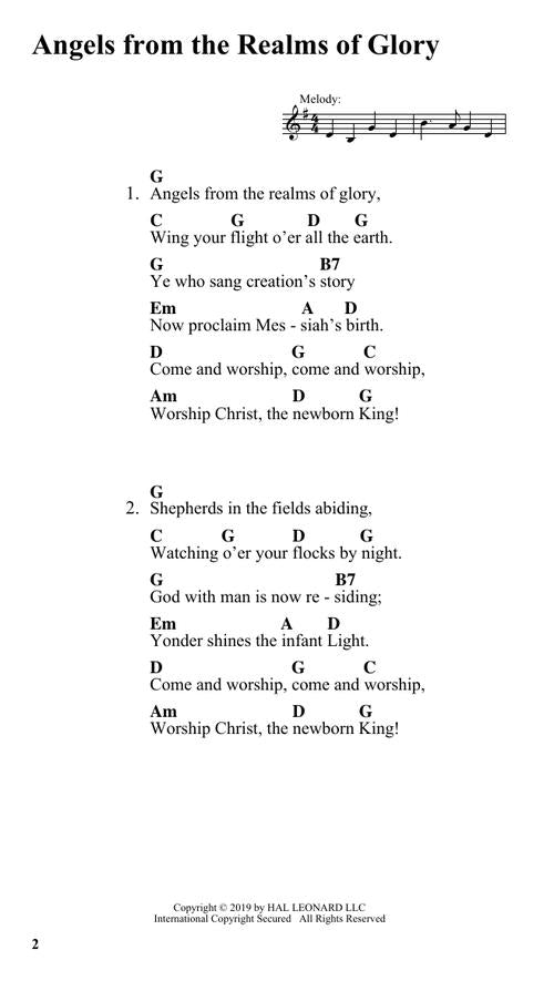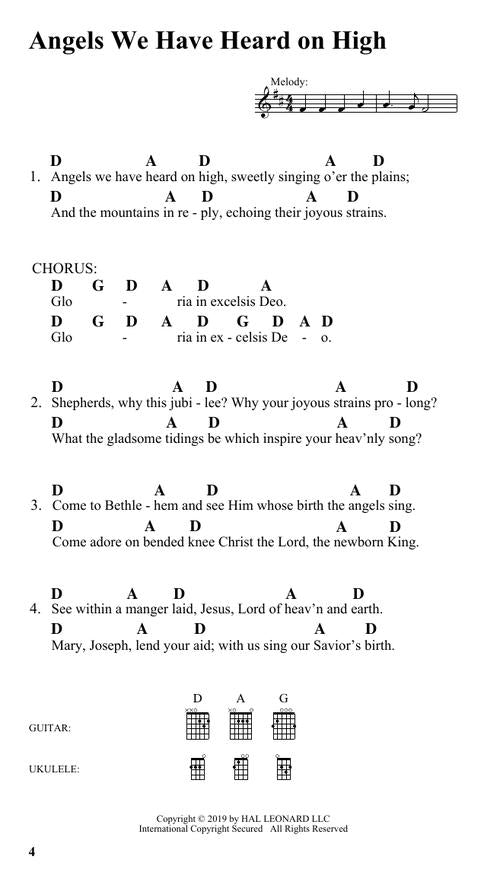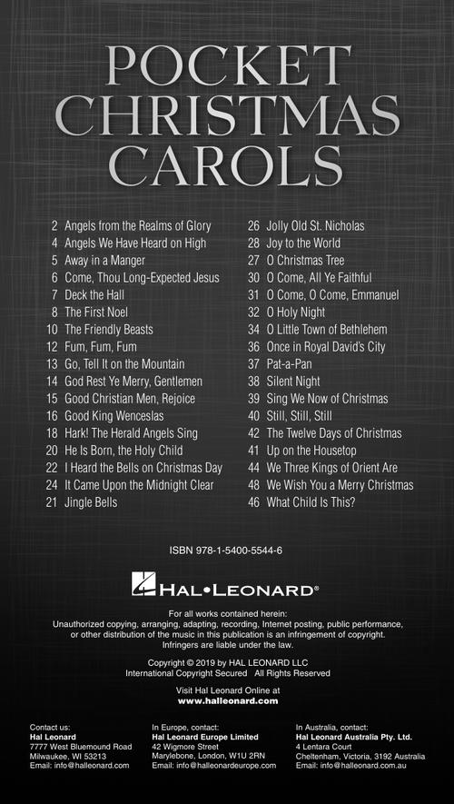 34 festive favorites in a portable caroling collection that includes chord diagrams for guitar and ukulele. Includes: Angels We Have Heard on High · Deck the Hall · The First Noel · God Rest Ye Merry, Gentlemen · It Came upon the Midnight Clear · Jingle Bells · Joy to the World · O Come, All Ye Faithful · Silent Night · The Twelve Days of Christmas · We Wish You a Merry Christmas · and more.