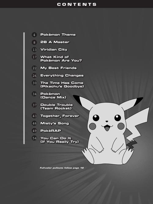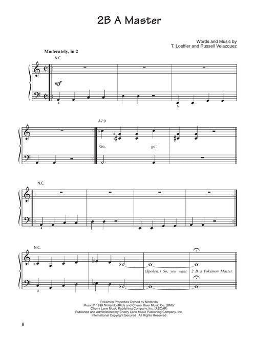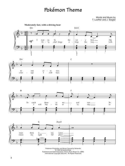 This great songbook features easy piano arrangements of 13 tunes from the hit TV series: 2.B.A. Master · Double Trouble (Team Rocket) · Everything Changes · Misty's Song · My Best Friends · Pokémon (Dance Mix) · Pokémon Theme · PokéRAP · The Time Has Come (Pikachu's Goodbye) · Together, Forever · Viridian City · What Kind of Pokémon Are You? · You Can Do It (If You Really Try). Includes a full-color, 8-page pull-out section featuring characters and scenes from this super hot show.