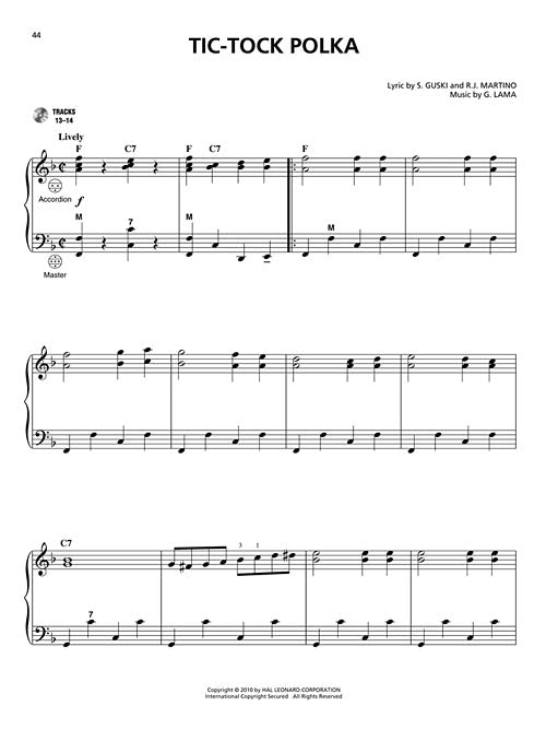 The Accordion Play-Along series features custom accordion arrangements with CD tracks recorded by a live band (accordion, bass and drums). There are two audio tracks for each song - a full performance for listening, plus a separate backing track which lets you be the soloist! The CD is playable on any CD player, and is also enhanced so Mac and PC users can adjust the recording to any tempo without changing the pitch! This volume features 8 songs: Beer Barrel Polka (Roll Out the Barrel) · Hoop-Dee-Doo · Hop-scotch Polka · Just Another Polka · Just Because · Pennsylvania Polka · Tic-Tock Polka · Too Fat Polka (She's Too Fat for Me).