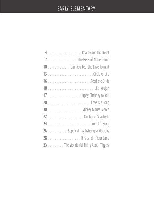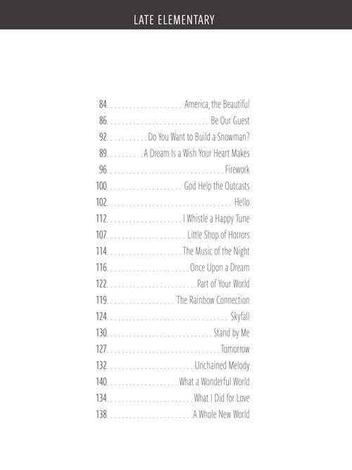 Being able to play songs you recognize soon after beginning piano lessons can be a key toward motivating students and boosting confidence as the building blocks to playing the instrument are starting to develop. This unique collection presents 50 popular songs at the early to late elementary level - perfect for users of the Hal Leonard Student Piano Library or any piano method. Songs include: America, the Beautiful · Be Our Guest · Climb Ev'ry Mountain · Do You Want to Build a Snowman? · Firework · Hallelujah · The Music of the Night · On Top of Spaghetti · Stand by Me · Tomorrow · Unchained Melody · What a Wonderful World · You'll Be in My Heart · and more.