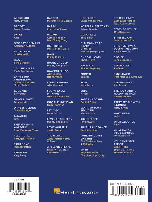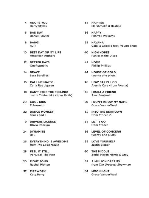 It's super easy! This series features accessible arrangements for piano, with simple right-hand melody, letter names inside each note, basic left-hand chord diagrams, and no page turns. It even includes lyrics for sing-along fun. This edition includes 60 pop songs kids love: Adore You · Best Day of My Life · Can't Stop the Feeling! · Dance Monkey · Firework · Happy · Let It Go · A Million Dreams · Shake It Off · Sunflower · What Makes You Beautiful · You Can't Stop the Girl · and more.
