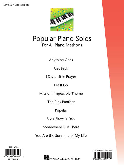 An outstanding pops book that correlates with Hal Leonard Student Piano Library Piano Lessons Book 5, this songbook is also a perfect supplementary choice for all methods. The expertly arranged solos include favorite Disney tunes, popular hits, and TV and movie theme songs. The updated second edition includes 10 songs: Anything Goes · Get Back · I Say A Little Prayer · Let It Go · Mission: Impossible Theme · The Pink Panther· Popular · Somewhere Out There · You Are the Sunshine of My Life. Level: Intermediate. Notation includes all note values and rests through 16th-note patterns; swing eighths and syncopation; simple and syncopated pedaling; Keys: C, G, F, D, B-Flat Major, and a, d and e minor; Intervals through an 8va; Full chords and inversions. Reading range: entire keyboard.