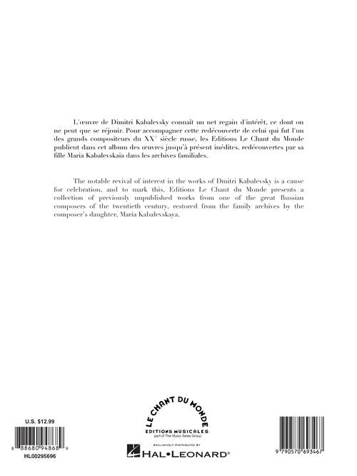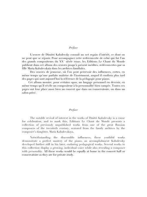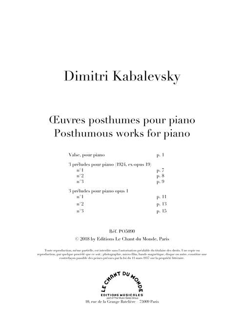 The notable revival of interest in the works of Dmitri Kabalevsky is a cause for celebration, and to mark this, Editions le Chant du Monde presents a collection of previously unpublished works from one of the great Russian composers of the twentieth century, restored from the family archives by the composer's daughter, Maria Kabalevskaya. Contents: Valse pour piano, 3 préludes pour piano (1924, ex-opus 19), 3 préludes pour piano opus 1.