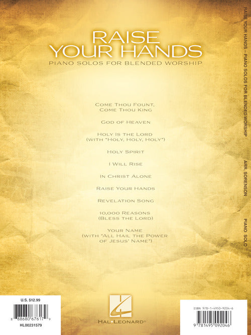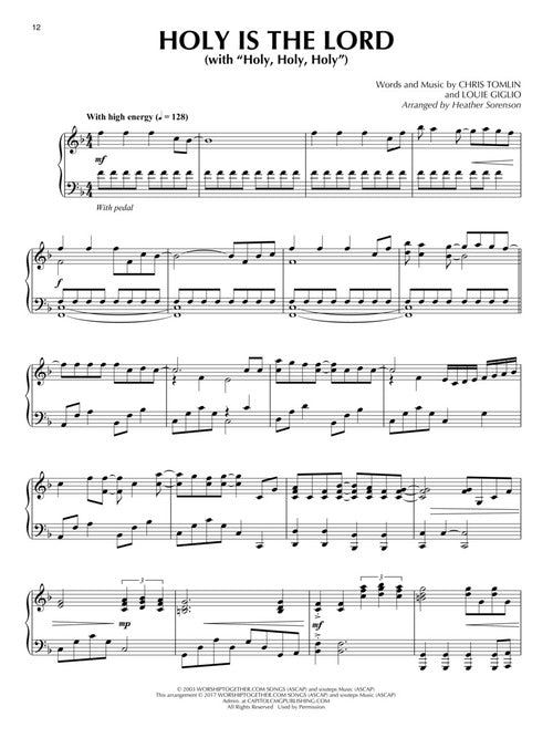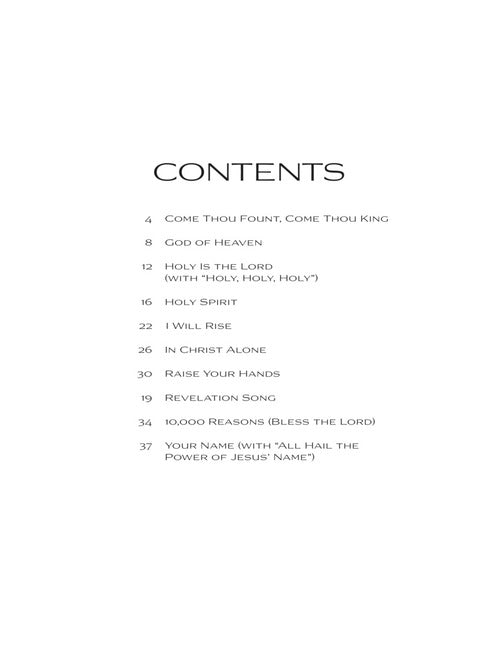 10 uplifting and worshipful solos crafted by Heather Sorenson. Includes two of her most popular originals and two medleys. Titles: Come Thou Fount, Come Thou King · God of Heaven · Holy Is the Lord (with Holy, Holy, Holy) · Holy Spirit · I Will Rise · In Christ Alone · Raise Your Hands · Revelation Song · 10,000 Reasons (Bless the Lord) · Your Name (with All Hail the Power of Jesus' Name).