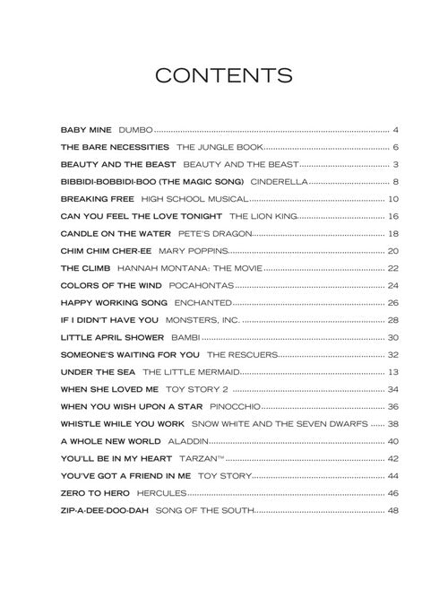 23 Disney favorites from the classics to contemporary blockbusters arranged for intermediate players. Includes: Baby Mine · Beauty and the Beast · Bibbidi-Bobbidi-Boo · Breaking Free · Can You Feel the Love Tonight · Chim Chim Cher-ee · The Climb · Under the Sea · When She Loved Me · When You Wish upon a Star · A Whole New World · You'll Be in My Heart · Zip-A-Dee-Doo-Dah · and more, complete with song background notes, and playing hints and tips.