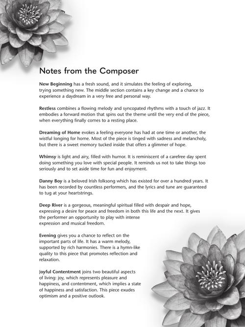 These eight insightful pieces are perfect for advancing pianists and were designed to give them the opportunity to reflect on various elements of life, past and present. Six are originals. Titles: Danny Boy · Deep River · Dreaming of Home · Evening · Joyful Contentment · New Beginning · Restless · Whimsy.