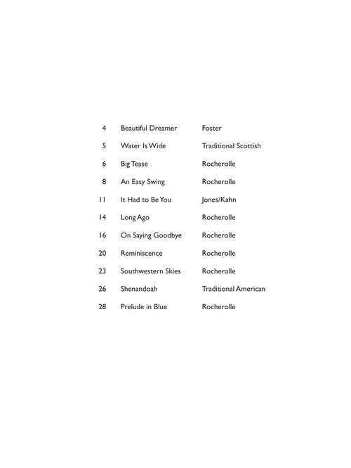 A combination of 11 original pieces plus familiar favorites by Rocherolle! Exploring modern works can be challenging; thus, this curated collection also includes familiar music that will bring hours of pleasure to both audience and performer. Pieces range in difficulty from intermediate to early advanced. Titles include: Beautiful Dreamer · Big Tease · An Easy Swing · It Had to Be You · Long Ago · On Saying Goodbye · Prelude in Blue · Reminiscence · Shenandoah · Southwestern Skies · Water Is Wide.