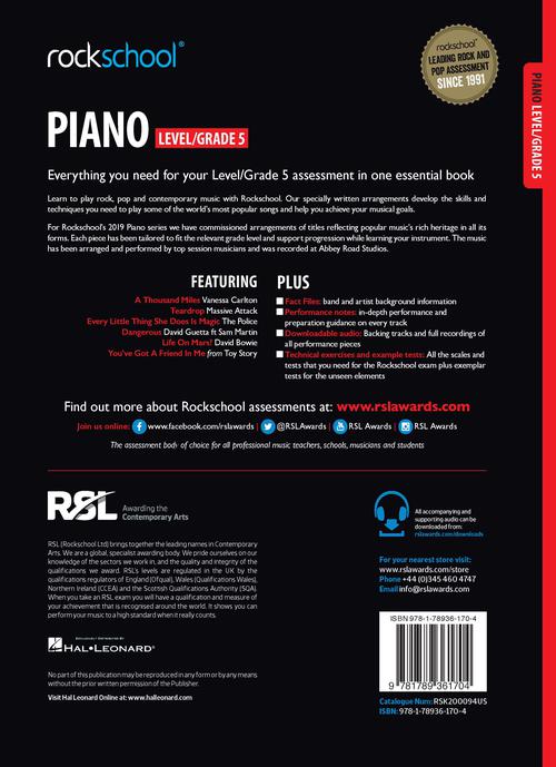 Learn to play rock and pop with Rockschool. These specially written arrangements develop the skills and techniques you need to help you achieve your musical goals. For Rockschool's piano series, Rockschool has commissioned arrangements of titles reflecting popular music's rich heritage in all its forms. Each piece has been tailored to fit the relevant grade level and support progression while learning your instrument. The music has been arranged and performed by top session musicians and was recorded at Abbey Road Studios. Songs include: Dangerous (David Guetta ft. Sam Martin) · Every Little Thing She Does Is Magic (The Police) · Life on Mars? (David Bowie) · Teardrop (Massive Attack) · A Thousand Miles (Vanessa Carlton) · You've Got a Friend in Me (from Toy Story). Plus: · Band and artist fact files with recommended listening · In-depth walkthroughs of every track · Easy-access downloadable audio of backing tracks and full recordings of all performance pieces · Example tests and exercises