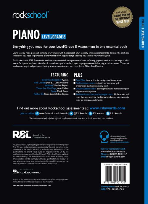 Learn to play rock and pop with Rockschool. These specially written arrangements develop the skills and techniques you need to help you achieve your musical goals. For Rockschool's piano series, Rockschool has commissioned arrangements of titles reflecting popular music's rich heritage in all its forms. Each piece has been tailored to fit the relevant grade level and support progression while learning your instrument. The music has been arranged and performed by top session musicians and was recorded at Abbey Road Studios. Songs include: Birdland (Weather Report) · Bohemian Rhapsody (Queen) · End Credits from E.T. · Rather Be (Clean Bandit ft Jess Glynne) · Spain (Chick Corea) · These Are the Days (Jamie Cullum). Plus: · Band and artist fact files with recommended listening · In-depth walkthroughs of every track · Easy-access downloadable audio of backing tracks and full recordings of all performance pieces · Example tests and exercises