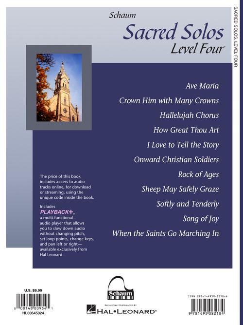 This series of sacred solos includes favorite hymns, gospel songs, spirituals and sacred music from classical repertoire. The selections have been made to appeal to students of all ages and also with regard to popularity in many different churches. Some of the hymn tunes may be known with different titles and lyrics. Level Four includes: Ave Maria (Schubert) · Crown Him with Many Crowns · Hallelujah Chorus · How Great Thou Art · I Love to Tell the Story · Onward Christian Soldiers · Rock of Ages · Sheep May Safely Graze · Softly and Tenderly · Song of Joy · When the Saints Go Marching In. Audio is accessed online using the unique code inside the book and can be streamed or downloaded. The audio files include PLAYBACK+, a multi-functional audio player that allows you to slow down audio without changing pitch, set loop points, change keys, and pan left or right.