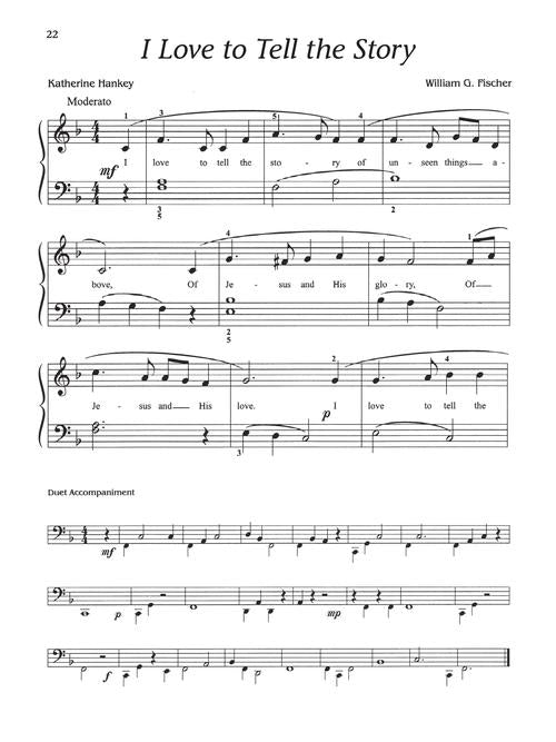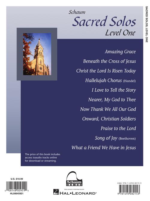 This series of sacred solos includes favorite hymns, gospel songs, spirituals and sacred music from classical repertoire. The selections have been made to appeal to students of all ages and also with regard to popularity in many different churches. Some of the hymn tunes may be known with different titles and lyrics. Duet accompaniments offer many possibilities for recitals and Sunday school participation. The duets help provide valuable rhythmic training and ensemble experience. Duets are recommended for use at home as well as at the lesson. Level 1 includes: Amazing Grace · Beneath the Cross of Jesus · Christ the Lord Is Risen Today · Hallelujah Chorus (Handel) · I Love to Tell the Story · Nearer My God to Thee · Now Thank We All Our God · Onward Christian Soldiers · Praise to the Lord · Song of Joy (Beethoven) · What a Friend We Have in Jesus.