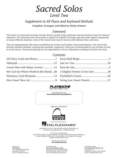 This series of sacred solos includes favorite hymns, gospel songs, spirituals and sacred music from classical repertoire. The selections have been made to appeal to students of all ages and also with regard to popularity in many different churches. Some of the hymn tunes may be known with different titles and lyrics. Duet accompaniments offer many possibilities for recitals and Sunday school participation. The duets help provide valuable rhythmic training and ensemble experience. Duets are recommended for use at home as well as at the lesson. Demonstration tracks are included for practice use. Level 2 includes: Allelujah · All Glory, Laud and Honor · Crown Him with Many Crowns · He's Got the Whole World in His Hands · Hosanna, Loud Hosanna · How Great Thou Art · Jesus Shall Reign · Just As I Am · Kum Ba Yah · A Mighty Fortress Is Our God · Pachelbel's Canon · Swing Low, Sweet Chariot. The audio is accessed online using the unique code inside the book and can be streamed or downloaded. The audio files include PLAYBACK+, a multi-functional audio player that allows you to slow down audio without changing pitch, set loop points, change keys, and pan left or right.