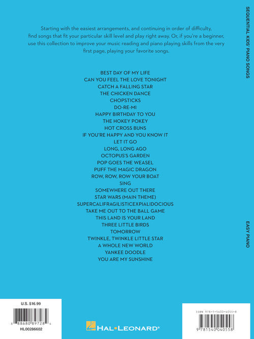 Kids of all ages can play their favorites songs with Sequential Kids' Piano Songs! Starting with the easiest arrangements (hands alone, very simple rhythms), and continuing in order of difficulty (including hands together, syncopated rhythms and moving around the keyboard), players can find songs that fit their particular skill level and play right away. Beginners can use these books to improve their music reading and piano skills from the very first page while playing the pop songs they love. This collection features 24 songs, including: Can You Feel the Love Tonight · The Chicken Dance · Do-Re-Mi · Happy Birthday to You · If You're Happy and You Know It · Let It Go · Star Wars (Main Theme) · Take Me Out to the Ball Game · Tomorrow · A Whole New World · and more.