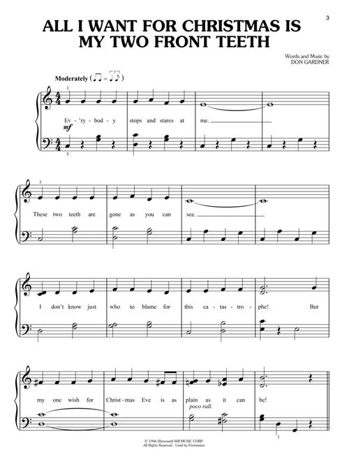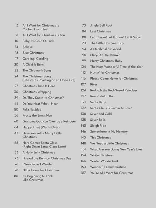 Play 50 well-loved holiday songs in the easiest of arrangements! Enjoy classic and contemporary favorites presented simply, with lyrics. Songs include: All I Want for Christmas Is My Two Front Teeth · Blue Christmas · Christmas Time Is Here · Feliz Navidad · Grandma Got Run over by a Reindeer · Have Yourself a Merry Little Christmas · It's Beginning to Look like Christmas · Jingle Bell Rock · Let It Snow! Let It Snow! Let It Snow! · The Most Wonderful Time of the Year · Nuttin' for Christmas · Rudolph the Red-Nosed Reindeer · Santa Claus Is Comin' to Town · Winter Wonderland · You're All I Want for Christmas · and more.