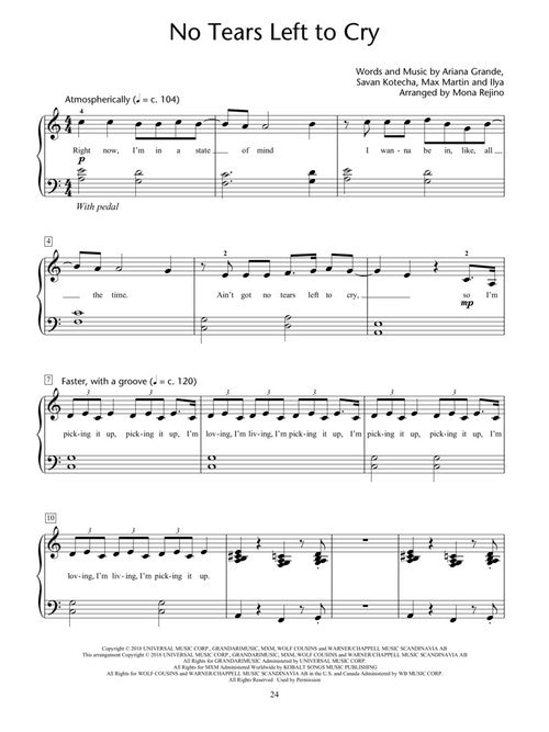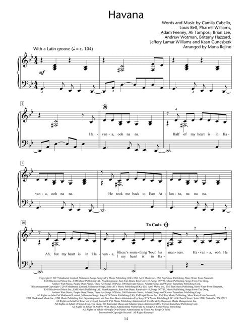 Eight chart-topping hits arranged especially for intermediate-level piano solo! Titles: Evermore (Beauty and the Beast) · Havana (Camila Cabello ft. Young Thug) · Meant to Be (Bebe Rexha ft. Florida Georgia Line) · The Middle (Zedd, Maren Morris & Grey) · A Million Dreams (The Greatest Showman) · No Tears Left to Cry (Ariana Grande) · Perfect (Ed Sheeran) · There's Nothing Holdin' Me Back (Shawn Mendes).