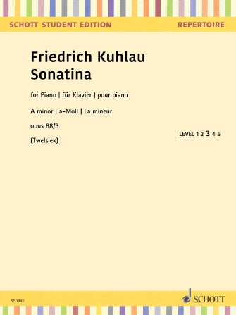 These real masterpieces, even if only a few minutes long, are of tremendous melodiousness and expressiveness!, Franz Schubert said about Friedrich Kuhlau's sonatinas. The four Sonatinas Op. 88 were written in 1827, i.e. during Friedrich Kuhlau's middle creative period, even before the great success of the opera Elfenhügel. and the year of Beethoven's death. All four works contain beautiful melodic ideas, but Sonatina Op. 88 No. 3 with its minor tonality, its free treatment of form and tempo in the first movement and the lively last movement is something special. Of medium difficulty, this sonatina is great fun to play. This edition is accompanied by a preface and Teaching Notes by Monika Twelsiek. It is part of the new Schott Student Edition series which offers varied literature at five different levels of difficulty, from 1 (easy) to 5 (difficult), for instrumental lessons. For further information on this series, see www.schott-student-edition.com.