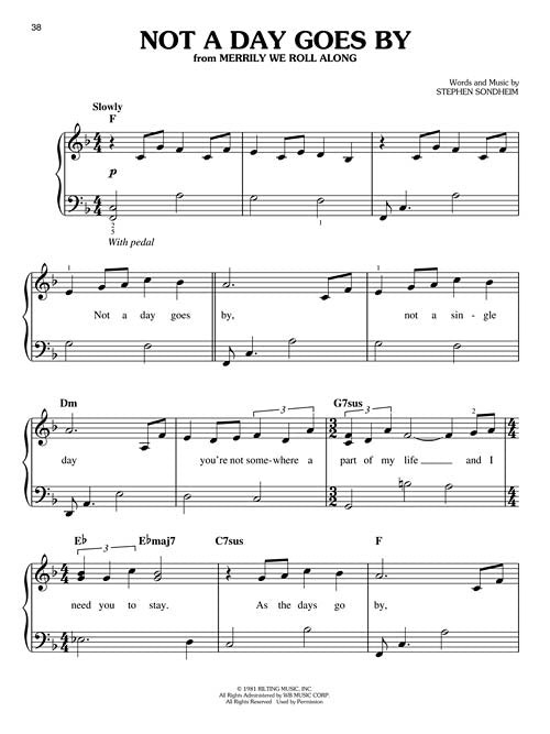 15 Sondheim standouts simplified for beginning players: Anyone Can Whistle · Broadway Baby · Children Will Listen · Comedy Tonight · Good Thing Going · Johanna · Losing My Mind · Loving You · Not a Day Goes By · Not While I'm Around · Old Friends · Pretty Women · Send in the Clowns · Side by Side by Side · Sunday. Includes lyrics and a composer bio.