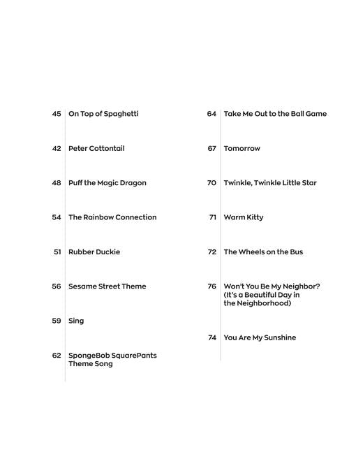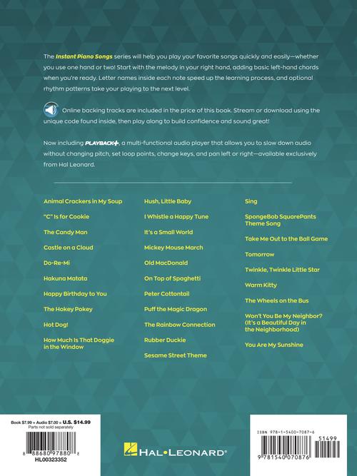 The Instant Piano Songs series will help you play your favorite songs quickly and easily - whether you use one hand or two! Start with the melody in your right hand, then add basic left-hand chords when you're ready. Letter names inside each note speed up the learning process, and optional rhythm patterns take your playing to the next level. Online backing tracks are also included. Stream or download the tracks using the unique codes inside each book, then play along to build confidence and sound great! This edition includes 30 songs kids love to play and sing, including: Do-Re-Mi · Hakuna Matata · It's a Small World · On Top of Spaghetti · Puff the Magic Dragon · The Rainbow Connection · SpongeBob SquarePants Theme Song · Take Me Out to the Ball Game · Tomorrow · The Wheels on the Bus · Won't You Be My Neighbor? (It's a Beautiful Day in the Neighborhood) · You Are My Sunshine · and more.