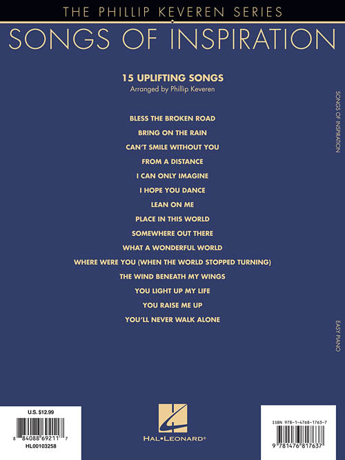 15 uplifting songs sure to encourage budding pianists as they learn to play them. Includes: Bless the Broken Road · From a Distance · I Hope You Dance · Lean on Me · Place in This World · Somewhere Out There · What a Wonderful World · You Raise Me Up · and more.