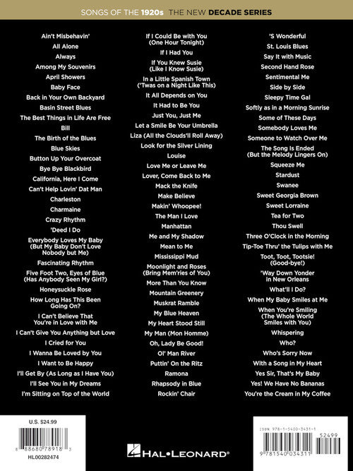This amazing collection gathers 100 hits of the day from the Roaring '20s. Songs include: Among My Souvenirs · April Showers · Button up Your Overcoat · Bye Bye Blackbird · California, Here I Come · Charmaine · I'll See You in My Dreams · It Had to Be You · Let a Smile Be Your Umbrella · Look for the Silver Lining · Mack the Knife · Makin' Whoopee! · The Man I Love · Moonlight and Roses (Bring Mem'ries of You) · Muskrat Ramble · My Blue Heaven · Puttin' on the Ritz · Ramona · St. Louis Blues · Side by Side · Sleepy Time Gal · Stardust · Swanee · Toot, Toot, Tootsie! (Good-bye!) · 'Way down Yonder in New Orleans · Whispering · Yes Sir, That's My Baby · Yes! We Have No Bananas · and more.
