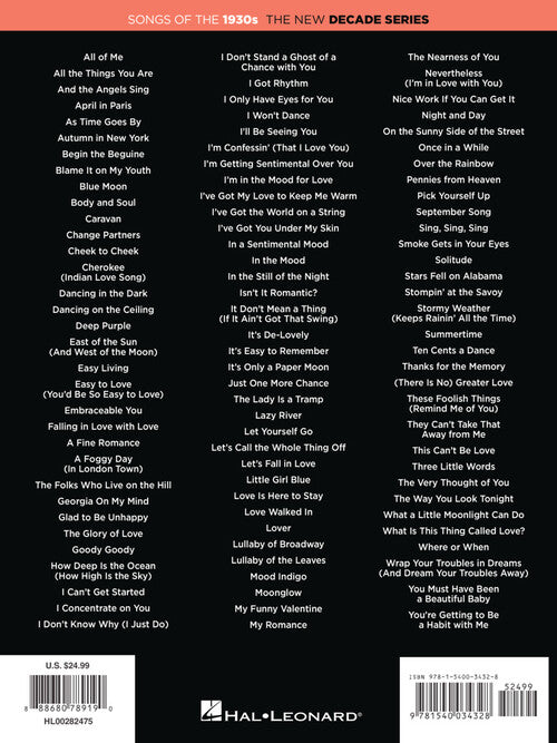 Music is what helped many keep their spirits up during the Great Depression in the 1930s. Here are 100 of the most memorable songs of the decade presented in easy piano arrangements with lyrics. Songs include: As Time Goes By · Blue Moon · Body and Soul · Embraceable You · Georgia on My Mind · The Glory of Love · How Deep Is the Ocean (How High Is the Sky) · I Don't Know Why (I Just Do) · I Got Rhythm · I'll Be Seeing You · In the Mood · The Lady Is a Tramp · Love Is Here to Stay · Mood Indigo · My Funny Valentine · The Nearness of You · Over the Rainbow · Sing, Sing, Sing · Summertime · Thanks for the Memory · The Very Thought of You · The Way You Look Tonight · and more.