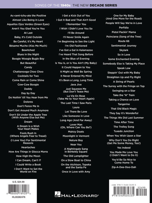100 songs popularized in the World War II era of the 1940s are included in this collection arranged for easy piano with lyrics. Songs include: Ac-cent-tchu-ate the Positive · Bésame Mucho (Kiss Me Much) · Boogie Woogie Bugle Boy · Chattanooga Choo Choo · Don't Get Around Much Anymore · A Dream Is a Wish Your Heart Makes · How High the Moon · I Get a Kick Out of You · It Might As Well Be Spring · Java Jive · Laura · Moonlight in Vermont · A Nightingale Sang in Berkeley Square · On a Slow Boat to China · Perfidia · Route 66 · Sentimental Journey · Some Enchanted Evening · The Surrey with the Fringe on Top · Take the A Train · Time After Time · When You Wish upon a Star · You'd Be So Nice to Come Home To · Zip-A-Dee-Doo-Dah · and more.