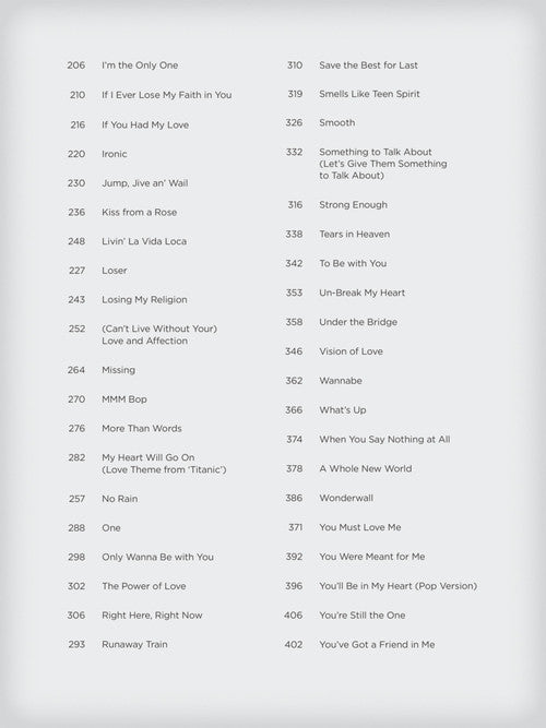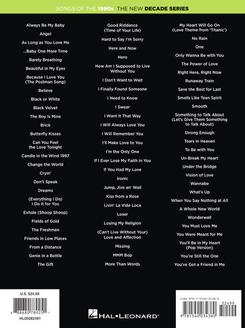 The 1990s saw the rise of R&B, boy bands and alternative rock as the 20th century came to a close. This collection features 80 songs from the decade arranged for easy piano with lyrics: Always Be My Baby · As Long As You Love Me · ...Baby One More Time · Black Velvet · Can You Feel the Love Tonight · Dreams · Fields of Gold · Friends in Low Places · Good Riddance (Time of Your Life) · How Am I Supposed to Live Without You · I Need to Know · I'm the Only One · Ironic · Livin' La Vida Loca · Losing My Religion · More Than Words · Only Wanna Be with You · Smells like Teen Spirit · Smooth · Tears in Heaven · Under the Bridge · You Must Love Me · You're Still the One · and more.