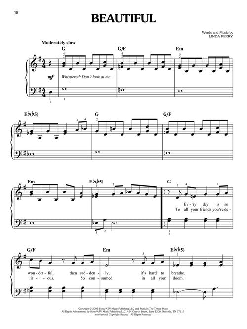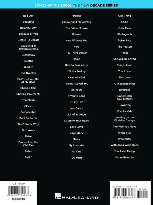 70 songs from the new millenium arranged for easy piano, including: Beautiful · Before He Cheats · Bye Bye Bye · Chasing Pavements · Don't Know Why · Drive · Fallin' · Hey There Delilah · I Gotta Feeling · I'm Yours · Just Dance · Love Story · Mercy · Only Time · The Reason · Rehab · This Love · A Thousand Miles · Umbrella · Viva La Vida · Waiting on the World to Change · With Arms Wide Open · You Raise Me Up · and more.