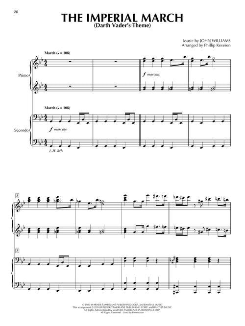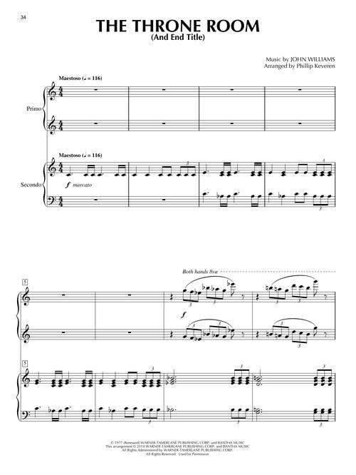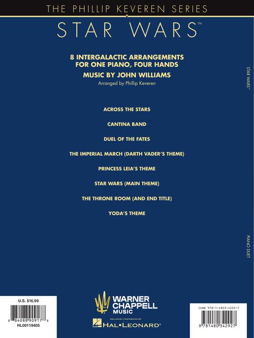 8 intergalactic arrangements of Star Wars themes for late intermediate to early advanced piano duet, including: Across the Stars · Cantina Band · Duel of the Fates · The Imperial March (Darth Vader's Theme) · Princess Leia's Theme · Star Wars (Main Theme) · The Throne Room (And End Title) · Yoda's Theme.