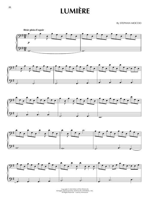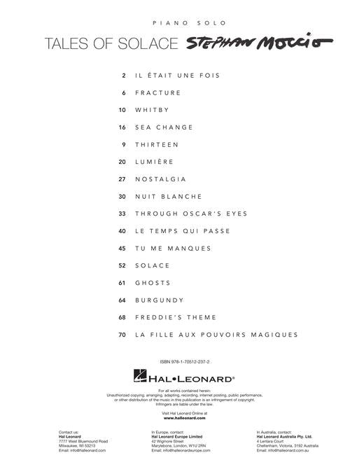 After writing chart-topping hits for the likes of Céline Dion, Avril Lavigne, Seal, and Josh Groban, multiple Grammy and Academy Award-nominated composer, songwriter, and producer Stephan Moccio released his debut album Tales of Solace on Decca Records in 2020. It is a provocative album of melodic, tender piano meditations set to soothe the soul. Exploring some of life's more profound themes, his first single Fracture was written in response to personal relationship struggles and the track Nostalgia comtemplates aging through the eyes of a Hollywood starlet past her prime, her illustrious career behind her, and is drawn also from personal experience. Freddie's Theme was inspired by the film Bohemian Rhapsody and its tragic yet beautiful story of Freddie Mercury falling in love with a woman as a gay man. Our matching folio includes piano solo arrangements of all 16 works, including: Burgundy · Fracture · Freddie's Theme · Ghosts · Il Était Une Fois · La Fille Aux Pouvoirs Magiques · Le Temps Qui Passe · Lumiére · Nostalgia · Nuit Blanche · Sea Change · Solace · Thirteen · Through Oscar's Eyes · Tu Me Manques · Whitby.