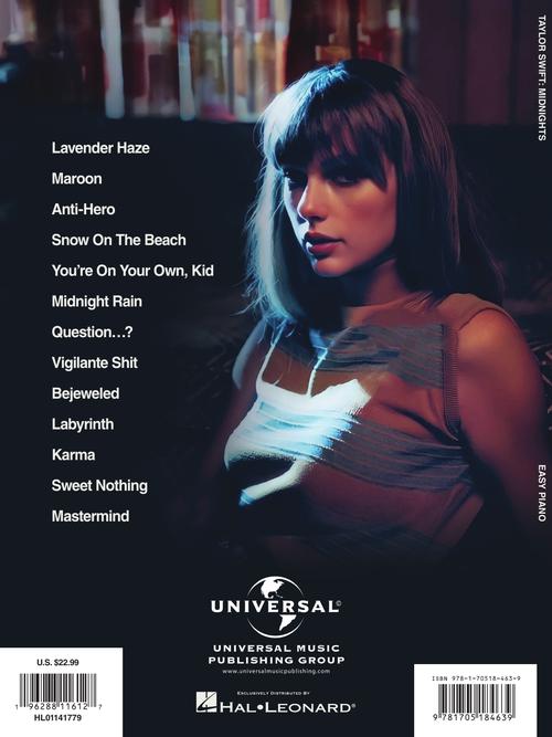 Taylor Swift's tenth studio album, Midnights, was released at midnight on 10/21/22 and immediately started breaking records. It was the most-streamed album ever in one day and its first-day sales alone made it the biggest-selling album of 2022 so far! Our matching songbook features all 13 songs arranged for easy piano with lyrics. Songs include: Anti-Hero · Bejeweled · Karma · Labyrinth · Lavender Haze · Maroon · Mastermind · Midnight Rain · Question? · Snow on the Beach · Sweet Nothing · You're on Your Own Kid · Vigilante Sh**.