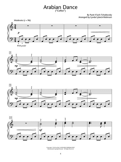 Six easy arrangements for piano solo from Tchaikovsky's famous ballet. The late-elementary to early-intermediate level will encourage students to play many, if not all of the selections in the book during the holiday season. Includes: Arabian Dance (Coffee) · Chinese Dance (Tea) · Dance of the Sugar Plum Fairy · March · Russian Dance (Trepak) · Waltz of the Flowers.