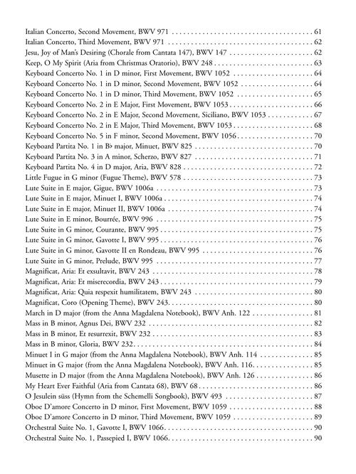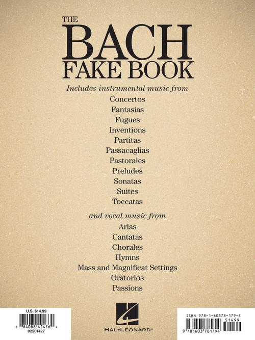 This incredible new comprehensive resource presents over 150 pieces by J. S. Bach in lead sheet format. It includes instrumental music from concertos, fantasias, fugues, inventions, partitas, passacaglias, pastorales, preludes, sonatas, suites, and toccatas as well as vocal music from arias, cantatas, chorales, hymns, mass and Magnifact settings, and oratorios.