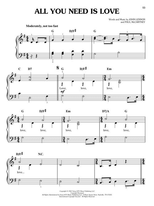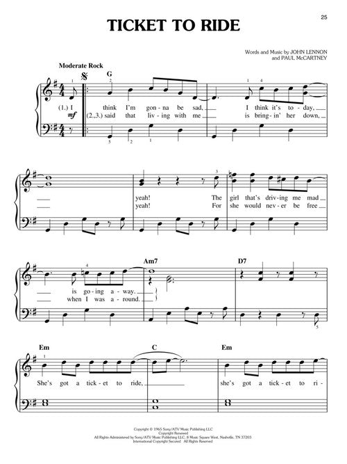 Hal Leonard is proud to present this matching songbook to the Beatles' landmark release of their #1 hits spanning 30 years. Songs include: All You Need Is Love · The Ballad of John and Yoko · Can't Buy Me Love · Come Together · Day Tripper · Eight Days a Week · Eleanor Rigby · From Me to You · Get Back · A Hard Day's Night · Hello, Goodbye · Help! · Hey Jude · I Feel Fine · I Want to Hold Your Hand · Lady Madonna · Let It Be · The Long and Winding Road · Love Me Do · Paperback Writer · Penny Lane · She Loves You · Something · Ticket to Ride · We Can Work It Out · Yellow Submarine · Yesterday.