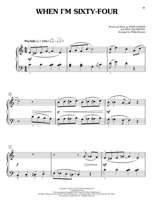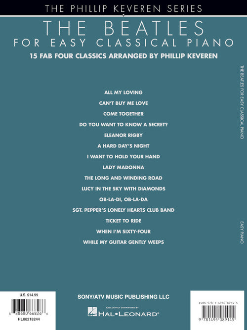 15 favorite songs of the Fab Four are masterfully presented in a classical style for easy piano by Phillip Keveren. Includes: All My Loving · Can't Buy Me Love · Eleanor Rigby · A Hard Day's Night · I Want to Hold Your Hand · Lucy in the Sky with Diamonds · Ob-La-Di, Ob-La-Da · Ticket to Ride · When I'm Sixty-Four · and more.