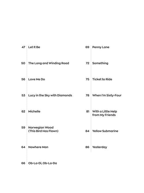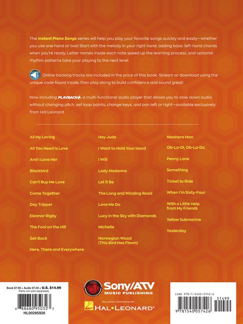 The Instant Piano Songs series will help you play your favorite songs quickly and easily - whether you use one hand or two! Start with the melody in your right hand, then add basic left-hand chords when you're ready. Letter names inside each note speed up the learning process, and optional rhythm patterns take your playing to the next level. Online backing tracks are also included. Stream or download the tracks using the unique codes inside each book, then play along to build confidence and sound great! This edition includes 30 Beatles favorites such as: Can't Buy Me Love · Come Together · Hey Jude · I Want to Hold Your Hand · Let It Be · Something · Yesterday · and more. Audio is accessed online using the unique code inside the book and can be streamed or downloaded. The audio files include PLAYBACK+, a multi-functional audio player that allows you to slow down audio without changing pitch, set loop points, change keys, and pan left or right.
