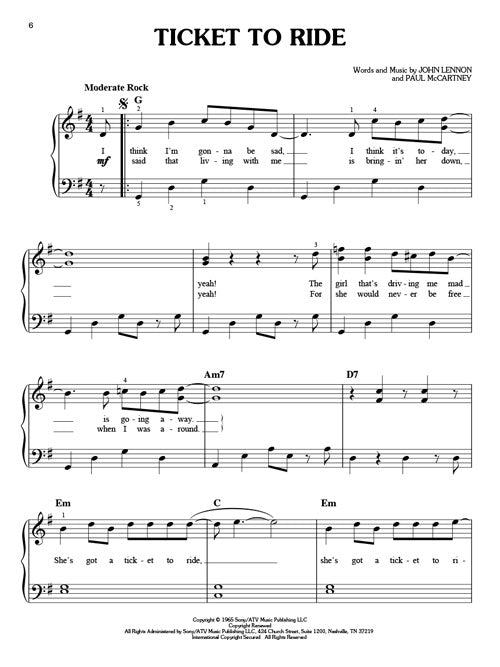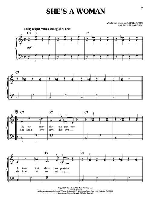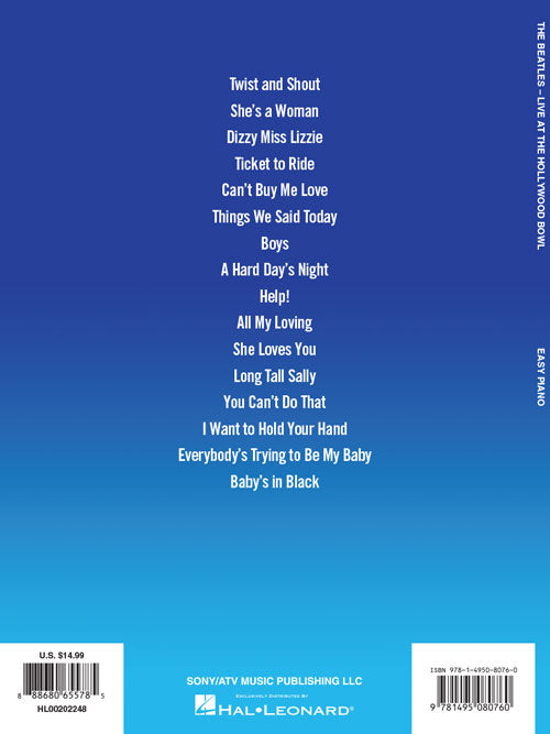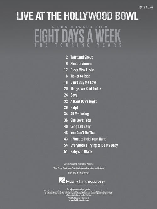 16 songs from the 2016 album release that coincides with the Ron Howard documentary, Eight Days a Week chronicling two infamous live performances by the Fab Four at the Hollywood Bowl in August 1964 and 1965. Includes easy piano arrangements with lyrics of: All My Loving · Baby's in Black · Boys · Can't Buy Me Love · Dizzy Miss Lizzie · Everybody's Trying to Be My Baby · A Hard Day's Night · Help! · I Want to Hold Your Hand · Long Tall Sally · She Loves You · She's a Woman · Things We Said Today · Ticket to Ride · Twist and Shout · You Can't Do That.