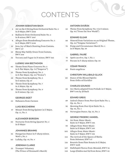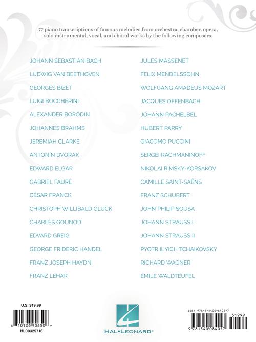 77 piano solo arrangements of beloved works from 34 composers for the intermediate-level pianist to enjoy. Includes: BACH: Air on the G String; Badinerie, BWV 1067; Allegro, BWV 1048; Jesu, Joy of Man's Desiring; Sheep May Safely Graze; Toccata and Fugue, BWV 565 · BEETHOVEN: Theme from Piano Concerto No. 5 (Emperor); Theme from Symphony No. 3 (Eroica); Theme from Symphony No. 5; Theme from Symphony No. 7; Theme from Symphony No. 9 · BIZET: Habanera from Carmen · BOCCHERINI: Minuet from String Quintet, Op. 11, No. 5 · BORODIN: Nocturne from String Quartet No. 2 · BRAHMS: Hungarian Dance, WoO 1, No. 5; Lullaby, Op. 49, No. 4 · CLARKE: Trumpet Voluntary · DVORÁK: Theme from Symphony No. 9 (From the New World) · ELGAR: Nimrod from Enigma Variations; Pomp and Circumstance · FAURÉ: Après un rêve, Op. 7, No. 1; Pavane, Op. 50 · FRANCK: Panis angelicus · GLUCK: Dance of the Blessed Spirits from Orfeo ed Euridice · GOUNOD: Ave Maria adapted from Prelude in C Major, BWV 846 by JS Bach · GREIG: Anitra's Dance from Peer Gynt Suite No. 1; Morning from Peer Gynt Suite No. 1; Norwegian Dance, Op. 35, No. 2 · HANDEL: Air from Water Music, HWV 348; Allegro from Water Music, HWV 349; Allegro from Water Music, HWV 348; The Arrival of the Queen of Sheba from Solomon; Bourrée from Flute Sonata, HWV 363b; Hallelujah Chorus from Messiah; Largo from Serses · HAYDN: Theme from String Quartet, Op. 3, No. 5; Theme from Symphony No. 94, Hob I:94 (Surprise) · LEHAR: Waltz from The Merry Widow · MASSENET: Meditation from Thaïs · MENDELSSOHN: Nocturne from A Midsummer Night's Dream; Wedding March from A Midsummer Night's Dream · MOZART: Ave Verum Corpus; Theme from Clarinet Concerto; Theme from Eine kleine Nachtmusik; Lacrimosa from Requiem; Theme from Piano Concerto No. 21; Theme from Symphony No. 40; Theme from Symphony No. 41 · Offenbach: Barcarolle from The Tales of Hoffmann; Can-Can from Orpheus in the Underworld · PACHELBEL: Canon in D · PARRY: Jerusalem · PUCCINI: Musetta's Waltz from La bohème; Un bel dì vedremo from Madame Butterfly; Vissi d'arte from Tosca · RACHMANINOFF: Theme from Piano Concerto No. 2 · RIMSKY-KORSAKOV: Flight of the Bumblebee; Song of India; The Young Prince and the Young Prince from Scheherazade · SAINT-SAËNS: Danse macabre; The Swan from The Carnival of the Animals · SCHUBERT: Ave Maria; Serenade · SOUSA: The Stars and Stripes Forever · J. STRAUSS I: Radetsky March · J. STRAUSS II: Emperor Waltz; On the Beautiful Blue Danube; Tales from the Vienna Woods; Voices of Spring · TCHAIKOVSKY: Dance of the Sugar Plum Fairy from The Nutcracker; Waltz of the Flowers from The Nutcracker; Theme from Romeo and Juliet; Theme from Swan Lake; Theme from Symphony No.5, Op. 58 · WAGNER: Bridal Chorus from Lohengrin; The Ride of the Valkyries from Die Walküre · WALDTEUFEL: The Sk