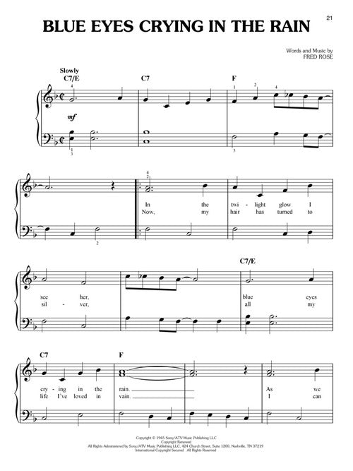 76 all-time country hits are featured in this updated second edition for easy piano. Includes: Always on My Mind · Blue · Could I Have This Dance · Crazy · Crying · Daddy Sang Bass · Forever and Ever, Amen · Friends in Low Places · God Bless the U.S.A. · Green Green Grass of Home · Help Me Make It Through the Night · I Fall to Pieces · King of the Road · Love Without End, Amen · Mammas Don't Let Your Babies Grow up to Be Cowboys · Need You Now · Rhinestone Cowboy · Stand by Your Man · Tennessee Waltz · Welcome to My World · Your Cheatin' Heart · and more.