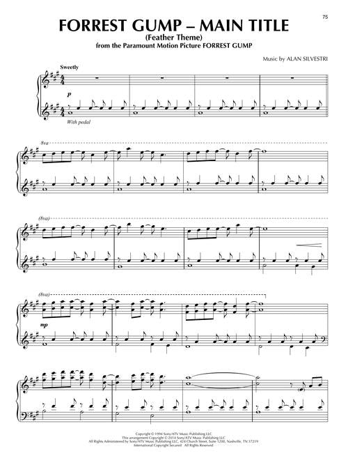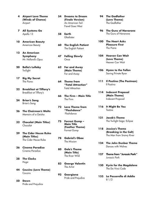 80 movie themes that work perfectly as piano solos, including: American Beauty · Bella's Lullaby · Breakfast at Tiffany's · Cinema Paradiso · The English Patient · Far and Away (Main Theme) · Forrest Gump - Main Title (Feather Theme) · Gabriel's Oboe · The Godfather (Love Theme) · Hedwig's Theme · Hymn to the Fallen · Il Postino (The Postman) · Jacob's Theme · Theme from Jurassic Park · Last of the Mohicans (Main Theme) · Theme from Lawrence of Arabia · The Man from Snowy River (Main Title Theme) · The Naked Gun from the Files of Police Squad! · On Golden Pond · A Prayer for Peace · The Promise (I'll Never Say Goodbye) · Raiders March · Ratatouille Main Theme · Theme from Schindler's List · Somewhere in Time · Star Wars (Main Theme) · Theme from Terms of Endearment · and more.