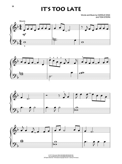 Eight Carole King classics arranged for beginners: Home Again · I Feel the Earth Move · It's Too Late · (You Make Me Feel Like) A Natural Woman · So Far Away · Up on the Roof · Will You Love Me Tomorrow (Will You Still Love Me Tomorrow) · You've Got a Friend.