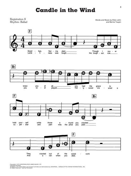The updated 8th edition of this bestseller includes 71 great favorites, all in our world-famous E-Z Play® notation: At Last · Bohemian Rhapsody · Candle in the Wind · Edelweiss · Hallelujah · I Dreamed a Dream · Moon River · My Way · Night and Day · Over the Rainbow · Piano Man · Send in the Clowns · Somewhere · Tears in Heaven · Unchained Melody · When I Fall in Love · Yesterday · and many more.