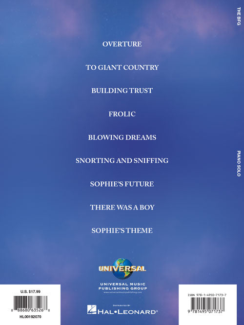 Nine selections as composed and conducted for the 2016 Disney motion picture by John Williams in piano solo notation. Includes: Blowing Dreams · Building Trust · Frolic · Overture · Snorting and Sniffing · Sophie's Future · Sophie's Theme · There Was a Boy · To Giant Country. Also includes 4 pages of full color art from the film.