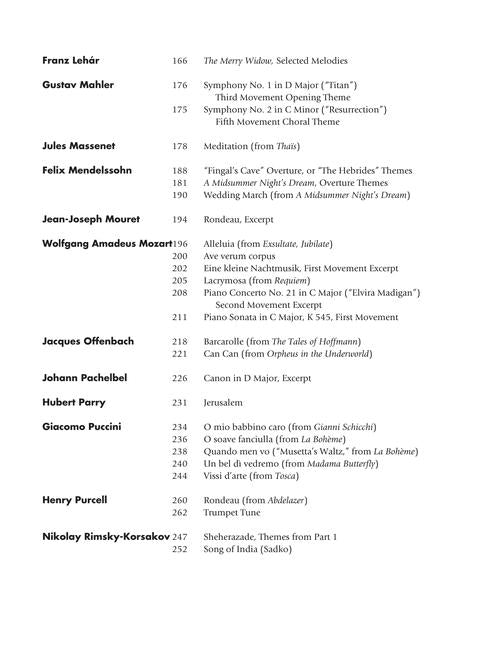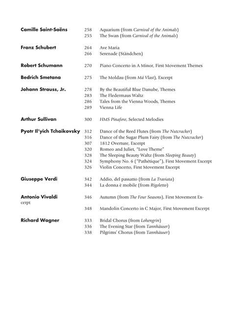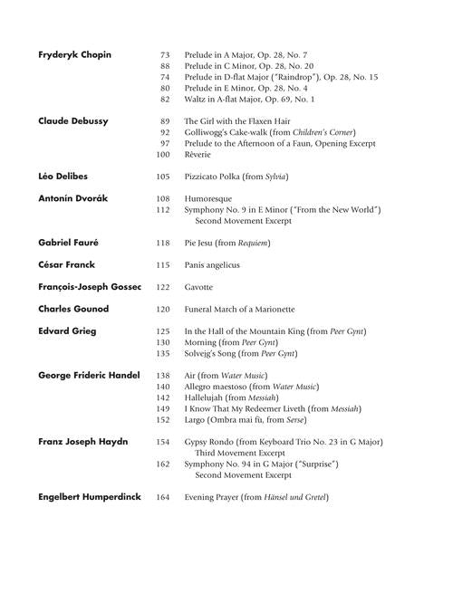 100 classics in intermediate level arrangements, with music by the great composers. Contents: ALBINONI: Adagio in G min · BACH: Air on the G String · Bist du bei mir · Jesu, Joy of Man's Desiring · Prelude in C Maj · Sheep May Safely Graze · BEETHOVEN: Sonata, Op. 13, Adagio · Fur Elise · Ode to Joy · Concerto No. 5, 1st mvt excerpt · Symphonies 3 & 5, 1st mvt excerpts · Turkish March · BIZET: Habanera · BORODIN: Polovetzian Dances, 1st theme · BRAHMS: Lullaby · Symphonies: No. 1, 4th mvt excerpt · No. 3, 3rd mvt excerpt · No. 4, 1st mvt excerpt · Waltz, Op. 39, No. 15 · CHOPIN: Preludes, Op. 28: No. 7 · No. 20 · No. 15 · No. 4 · Waltz, Op. 69, No. 1 · DEBUSSY: The Girl with the Flaxen Hair · Golliwogg's Cake-walk · Prelude to the Afternoon of a Faun, Opening excerpt · Reverie · DELIBES: Pizzicato Polka · DVORAK: Humoresque · Symphony NO. 9, 2nd mvt excerpt · FAURE: Pie Jesu · FRANCK: Panis angelicus · GOSSEC: Gavotte · GOUNOD: Funeral March of a Marionette · GRIEG: In the Hall of the Mountain King · Morning · Solvejg's Song · HANDEL: Water Music: Air · Allegro maestoso · Messiah: Hallelujah · I Know That My Redeemer Liveth · Serse: Largo · HAYDN: Keyboard Trio No. 23, 3rd mvt excerpt · Symphony No. 94, 2nd mvt excerpt · HUMPERDINCK: Evening Prayer · LEHAR: The Merry Widow, Selections · MAHLER: Symphonies: No. 1, 3rd mvt Opening · No. 2, 5th mvt Choral · MASSENET: Meditation · MENDELSSOHN: Hebrides themes · A Midsummer Night's Dream, Overture themes · MOURET: Rondeau · MOZART: Alleluia · Ave verum corpus · Eine kleine Nachtmusic, 1st mvt excerpt · Lacrymosa · Piano Concerto No. 21, 2nd mvt excerpt · Piano Sonata, K. 545, 1st mvt · OFFENBACH: Barcarolle (The Tales of Hoffmann) · Can Can · PACHELBEL: Canon in D · PARRY: Jerusalem · PUCCINI: O mio babbino caro · O soave fanciulla · Quando men vo · Un bel di vedremo · Vissi d'arte · PURCELL: Rondeau (Abdelazer) · Trumpet Tune · RIMSKY-KORSAKOV: Scheherazade, Part 1 themes · SAINT-SAENS: Carnival of the Animals: Aquarium · The Swan · SCHUBERT: Ave Maria · Serenade · SCHUMANN: Piano Concerto in A minor, 1st mvt themes · SMETANA: The Moldau excerpt · J STRAUSS II: By the Beautiful Blue Danube, themes · The Fledermaus Waltz · Tales from the Vienna Woods, themes · Vienna Life · SULLIVAN: HMS Pinafore, Selections · TCHAIKOVSKY: Dance of the Reed Flutes · Dance of the Sugar Plum Fairy · 1812 Overture, excerpt · Romeo and Juliet, Love theme · The Sleeping Beauty Waltz · Symphony No. 6, 1st mvt excerpt · Violin Concerto 1st mvt excerpt · VERDI: Addio, del passatto · La donna e mobile · VIVALDI: Autumn, 1st mvt excerpt · Mandolin Concerto, 1st mvt excerpt · WAGNER: Bridal Chorus (Lohengrin) · The Evening Star (Tannhauser) · Pilgrims' Chorus (Tannhauser)